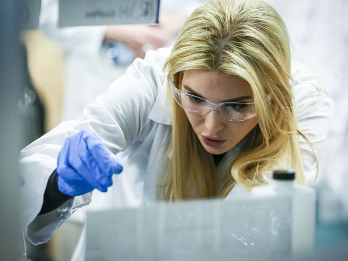 Ivanka se puso una bata de laboratorio blanca, guantes de latex y lentes de seguridad antes de extraer el jugo de vape con una pipeta y después ponerlo en su vaso de cristal.