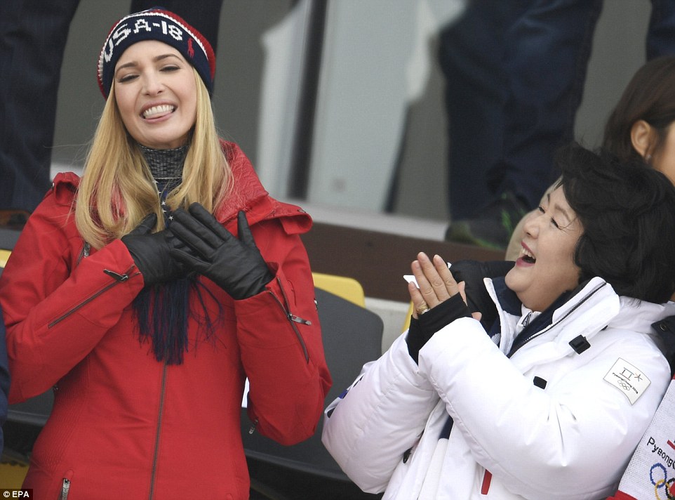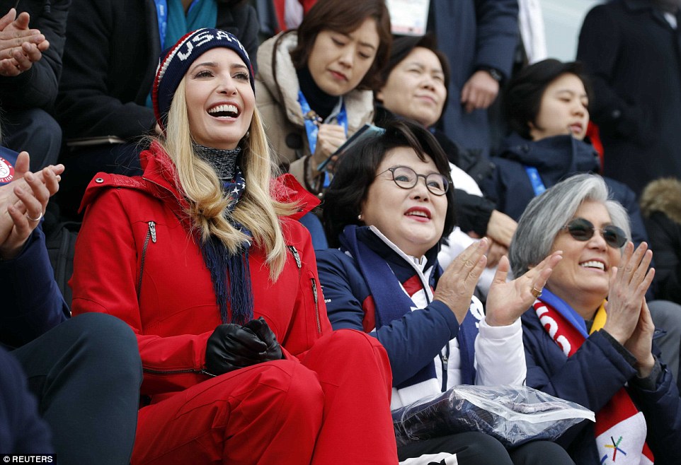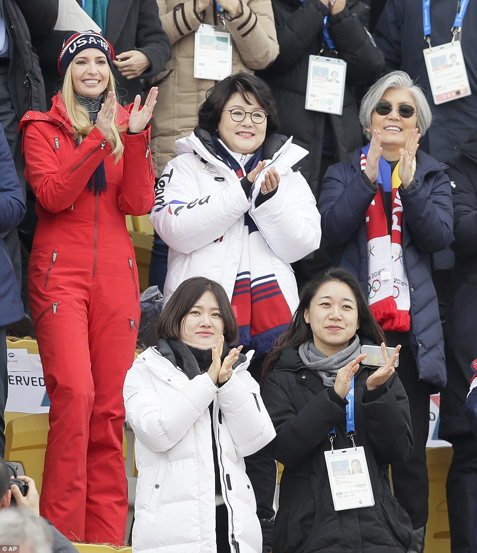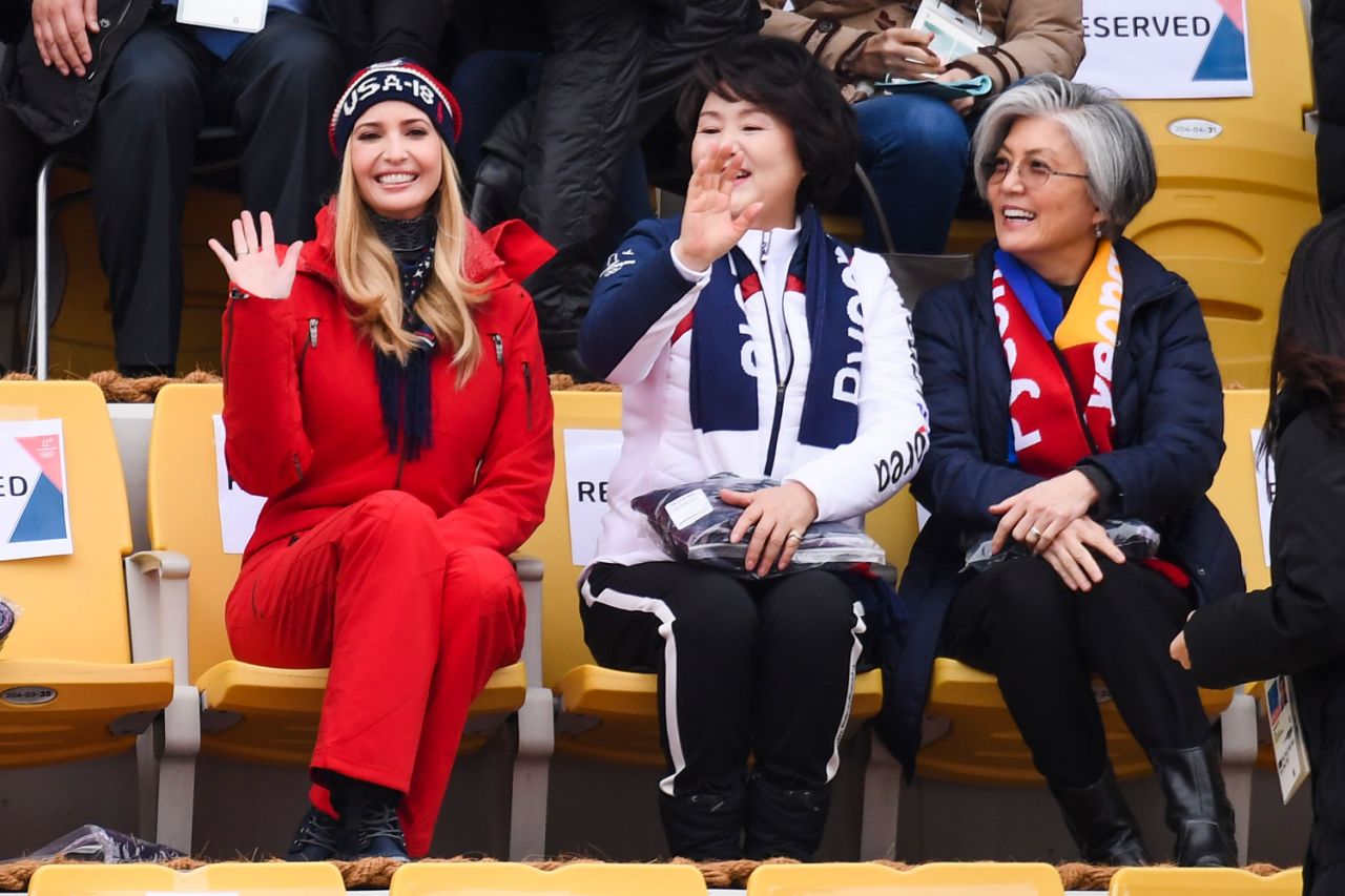 Ivanka reacciona ante un momento emocionante mientras la esposa del Presidente Coreano kim Jung-sook apoya al equipo.