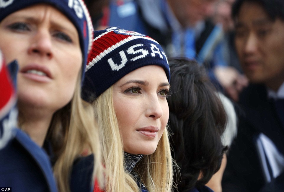 Ivanka en la foto inferior con su mano derecha indicando así se hacemientras ve la competencia por la medalla de oro entre Estados Unidos y Suecia en la foto inferior.