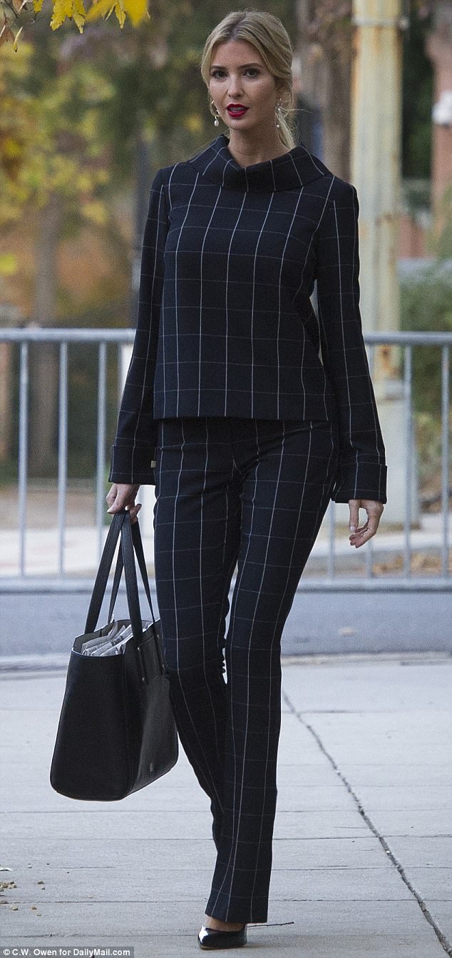 Ivanka dirigiéndose a la Casa Blanca a las 7:30 am hizo Jaque Mate con un Bonito coordinado negro con un patrón de tablero de ajedrez.